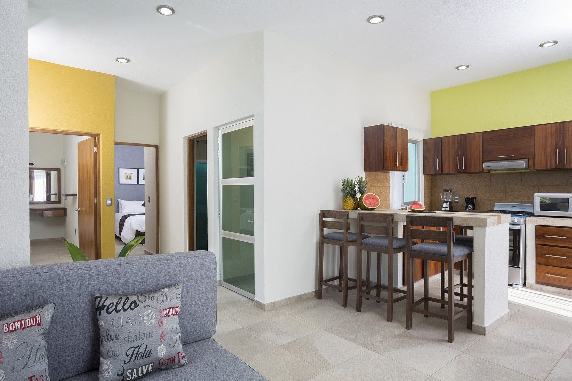 - Refrigerador, cafetera, horno de microondas, horno tostador y estufa, utensilios para cocina (cubiertos, vasos, tazas, platos, ollas y cazuelas)